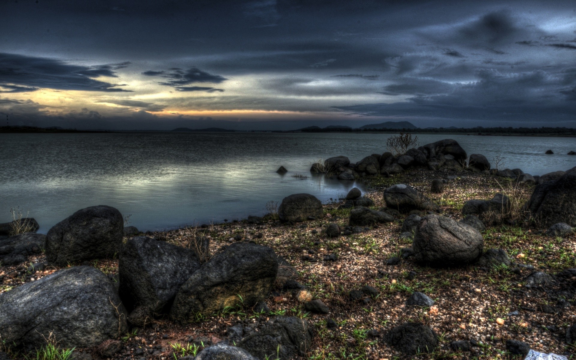 Nuages bas sur la mer. Plage au coucher du soleil