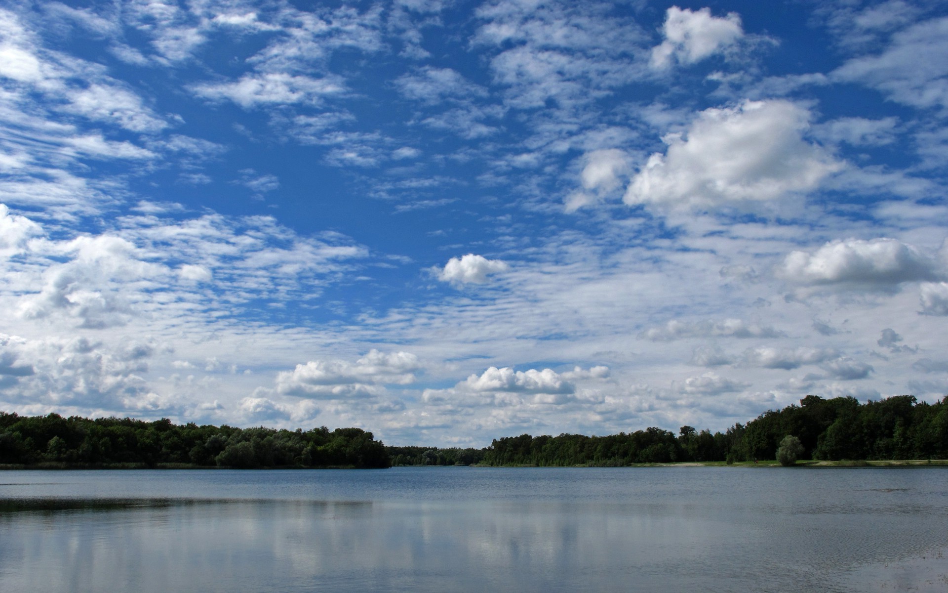 Paysage de lac, d'arbres et de ciel bleu avec des nuages