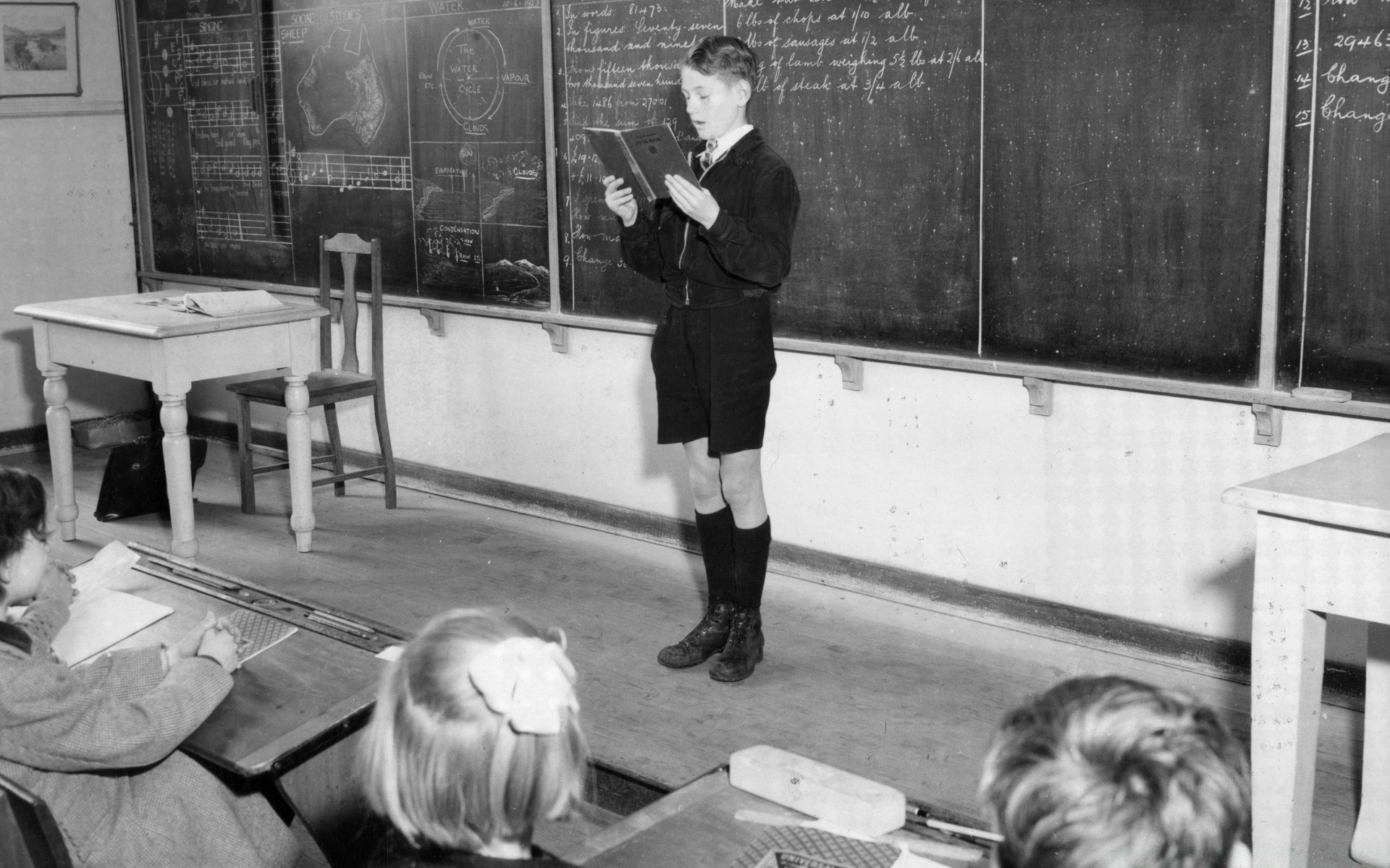 Un écolier lit devant la classe une vieille photo