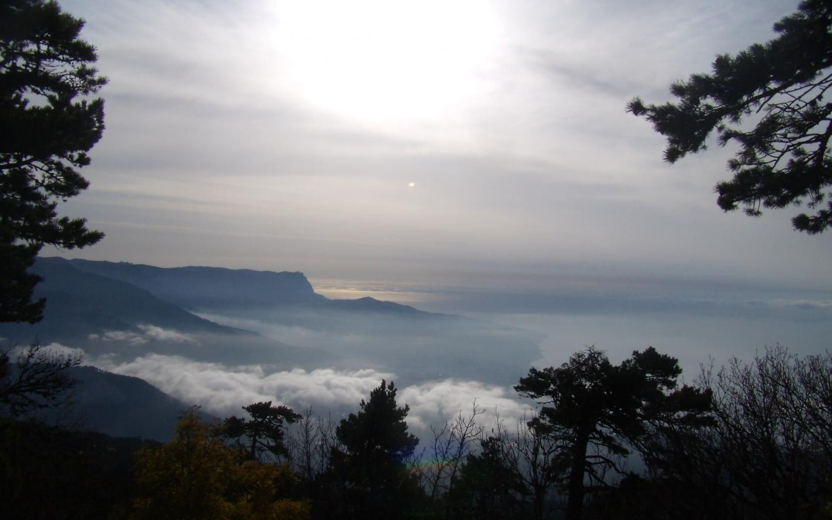 Homme assis sur un rocher. Paysage de montagne. Mer