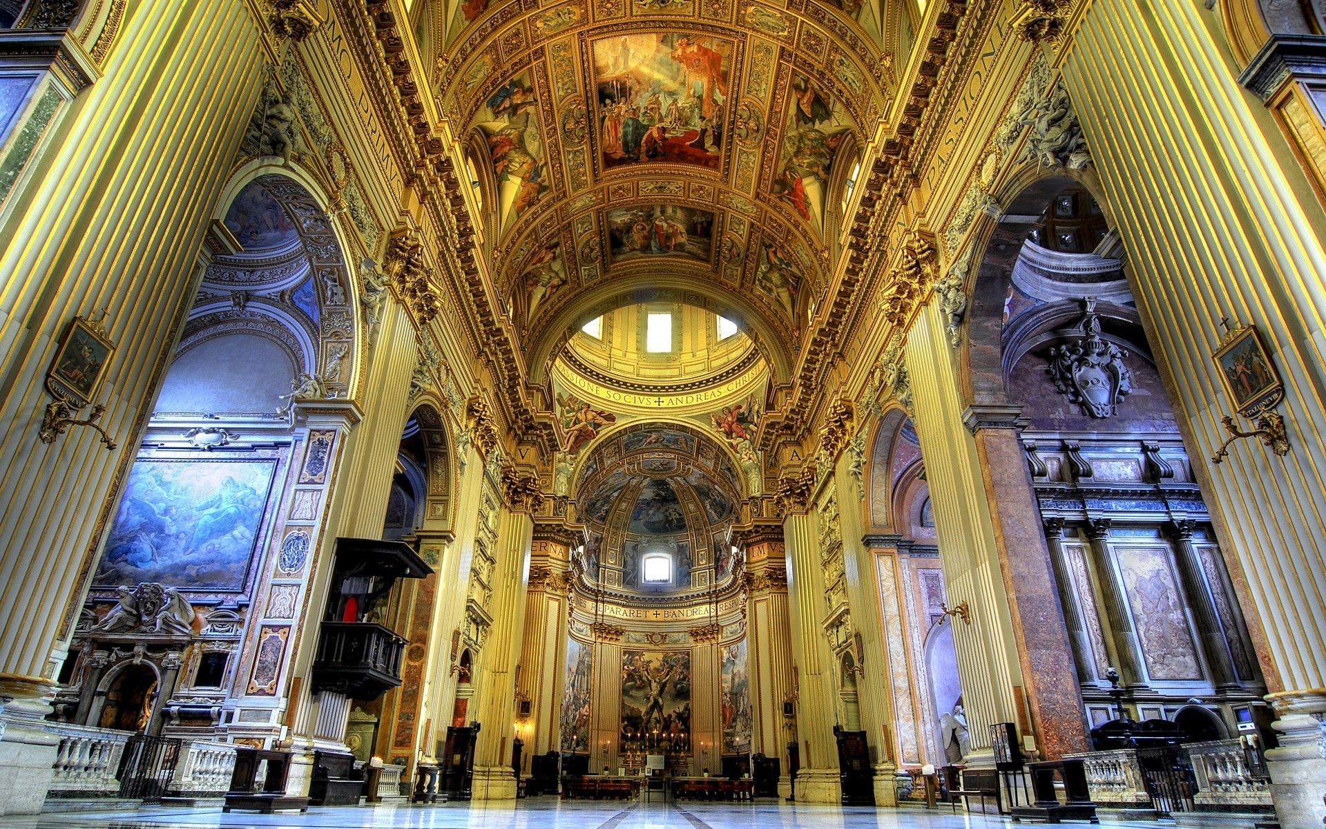 À l'intérieur, le plafond du bâtiment est décoré d'un dôme complexe avec des ornements en verre coloré
