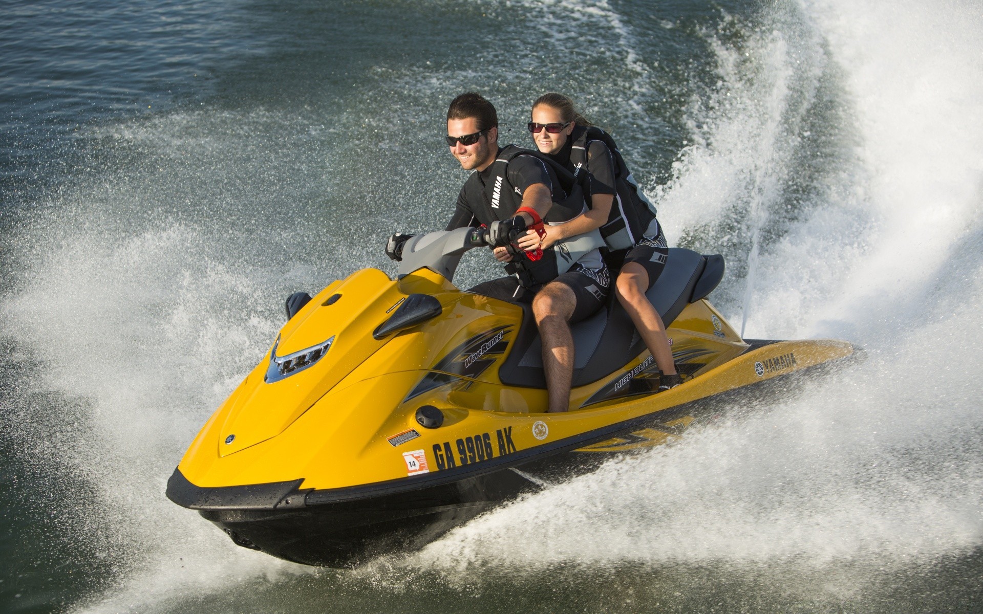 Deux personnes montent un scooter d'eau