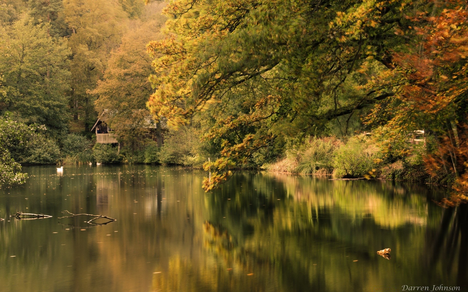 Arbres en tenue d'automne qui se reflètent dans la surface du lac par temps clair et sans vent
