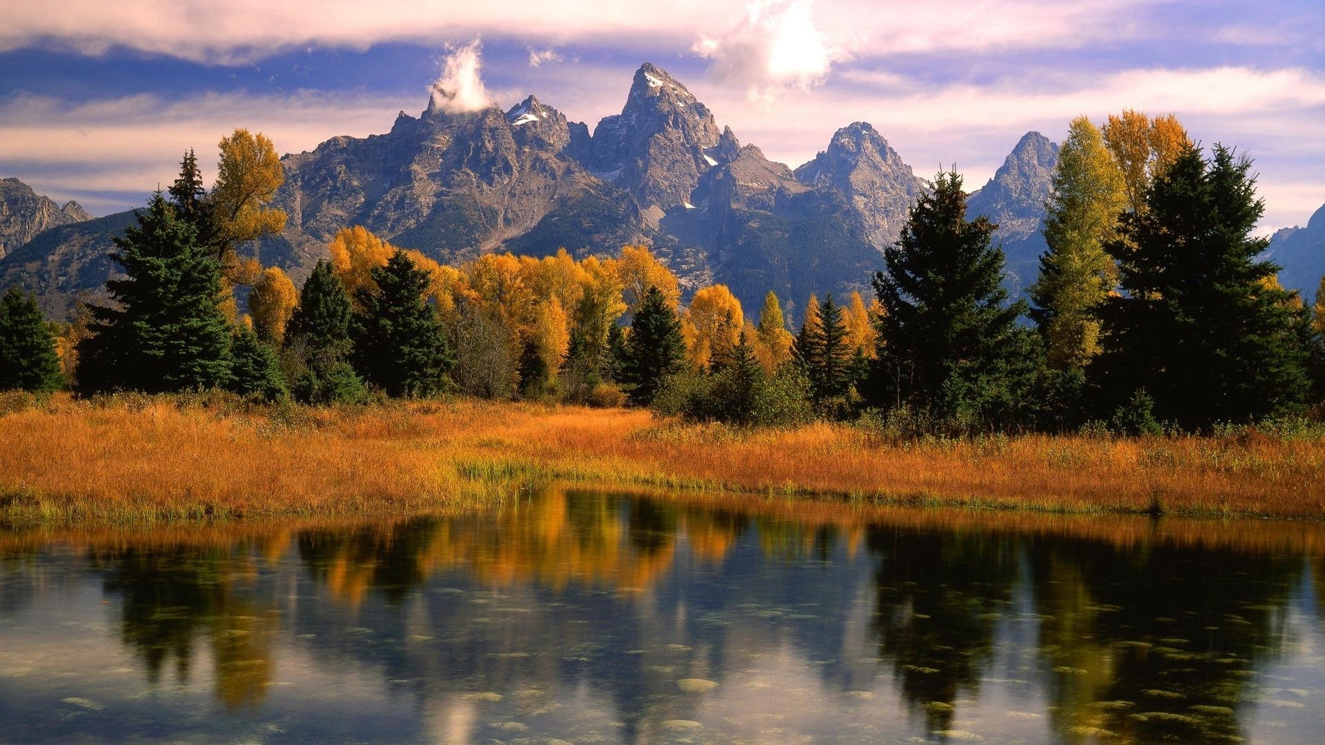 Forêt d'automne près du réservoir sur le fond des montagnes