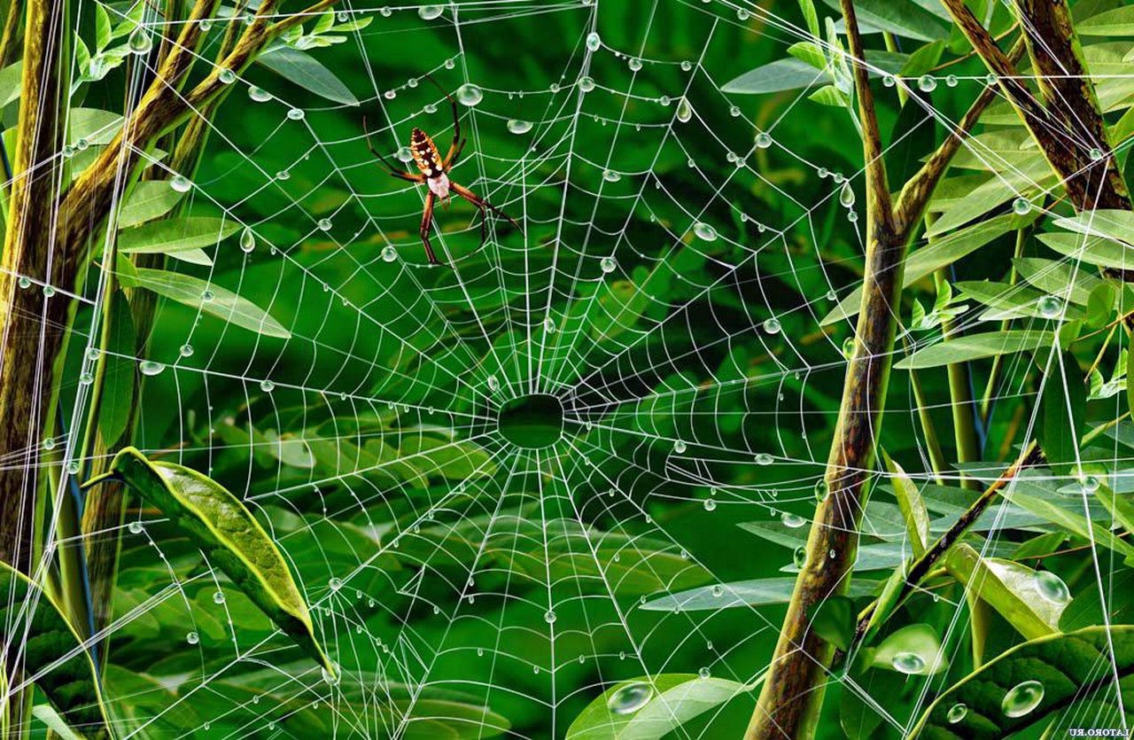 Gouttes de rosée sur la toile d'araignée. Feuillage vert