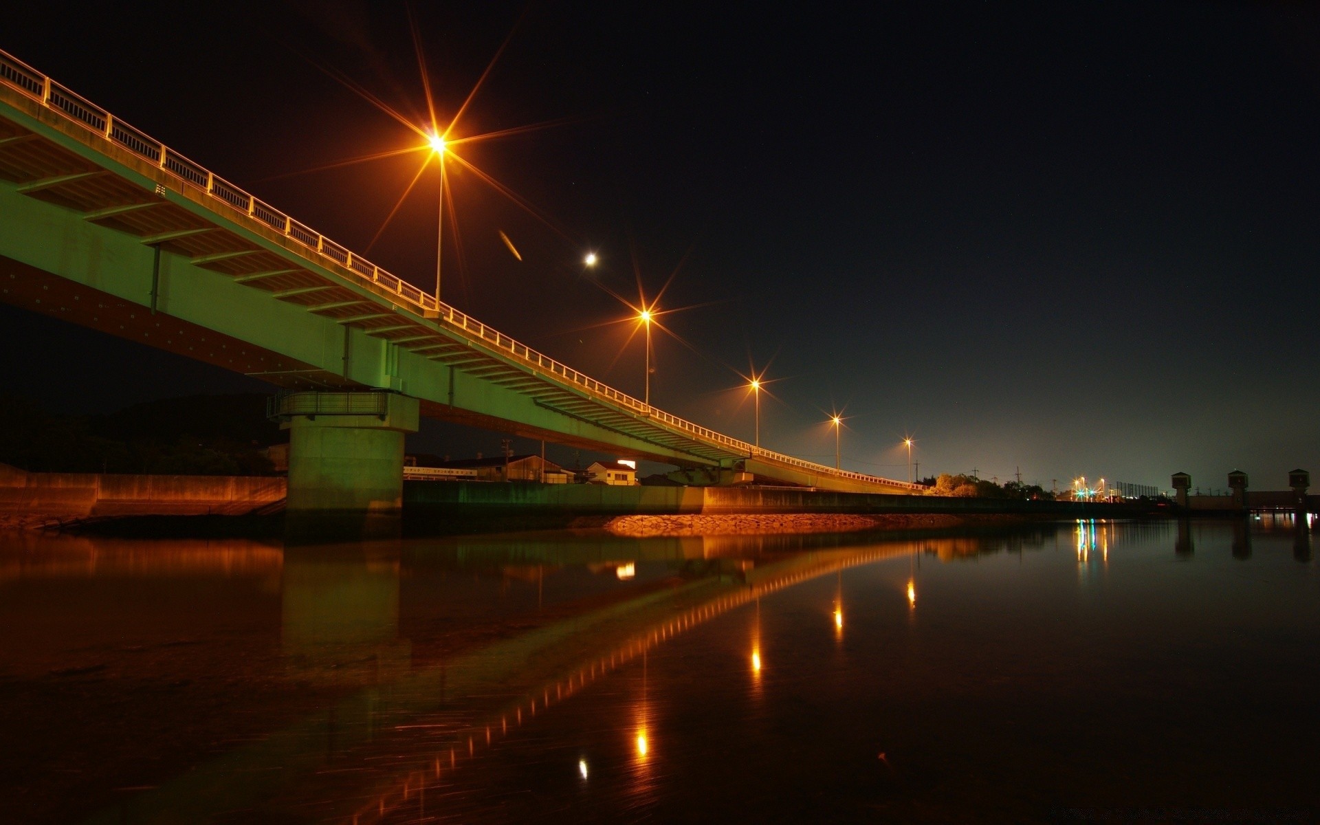 Pont de nuit au-dessus de l'eau éclairé par des lumières