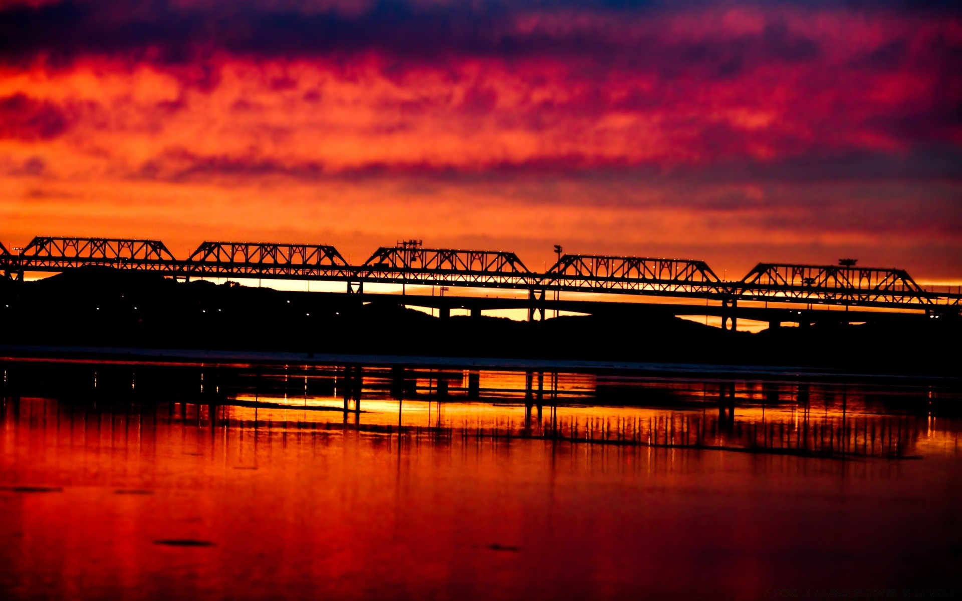 Dans le reflet de l'eau, le pont est visible sur le fond du coucher de soleil