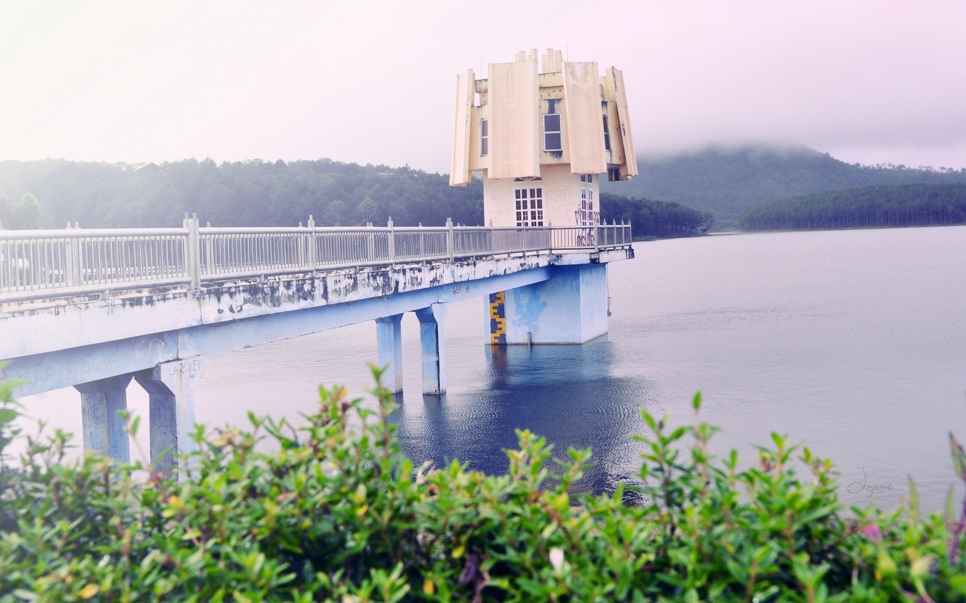 Pont sur la rivière sur fond de ciel coucher de soleil