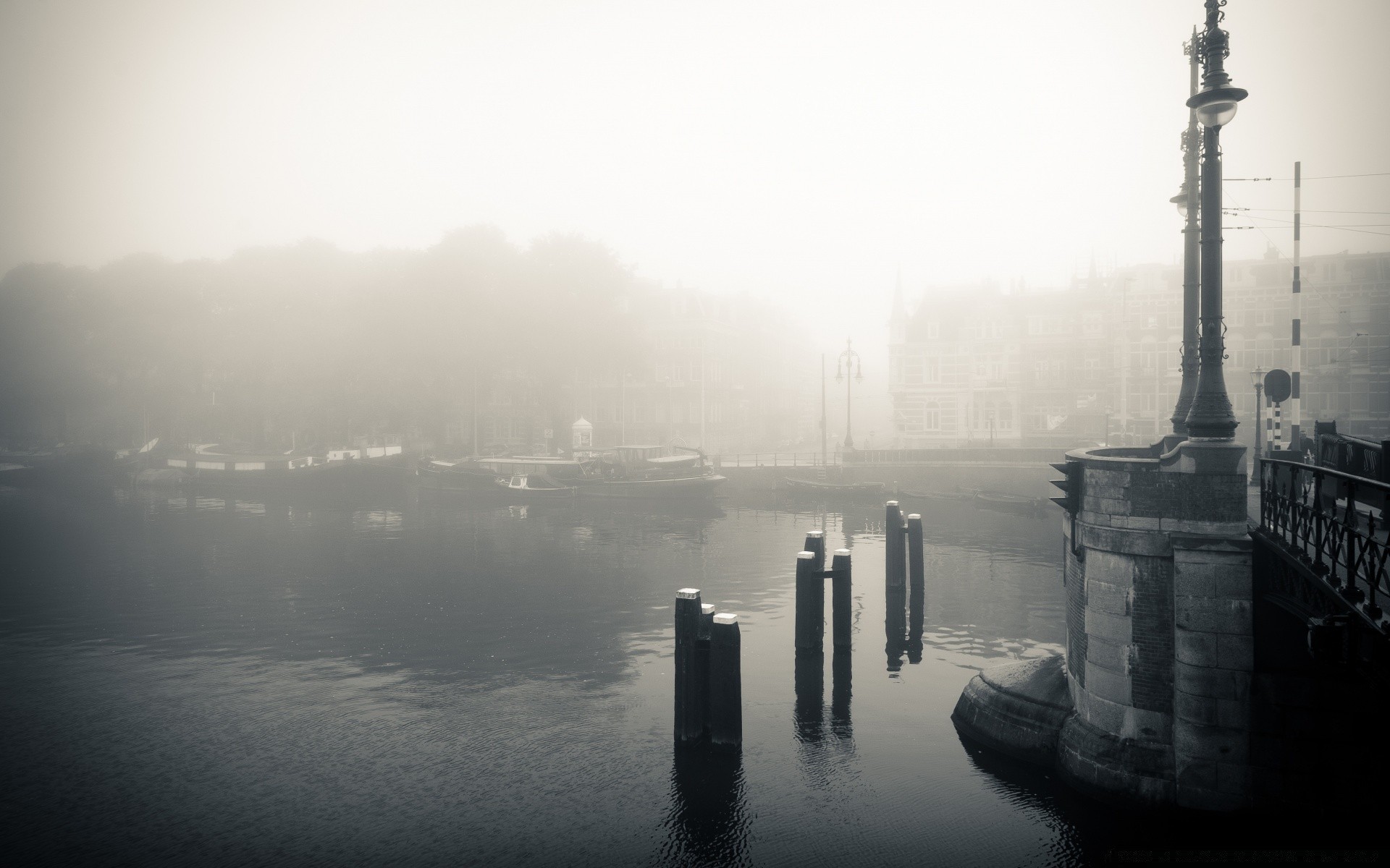 Vue en noir et blanc du pont dans le brouillard