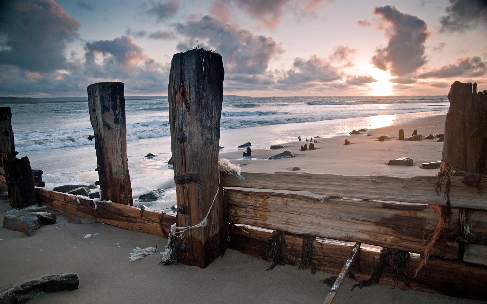 Coucher de soleil sur la mer. Jetée et plage