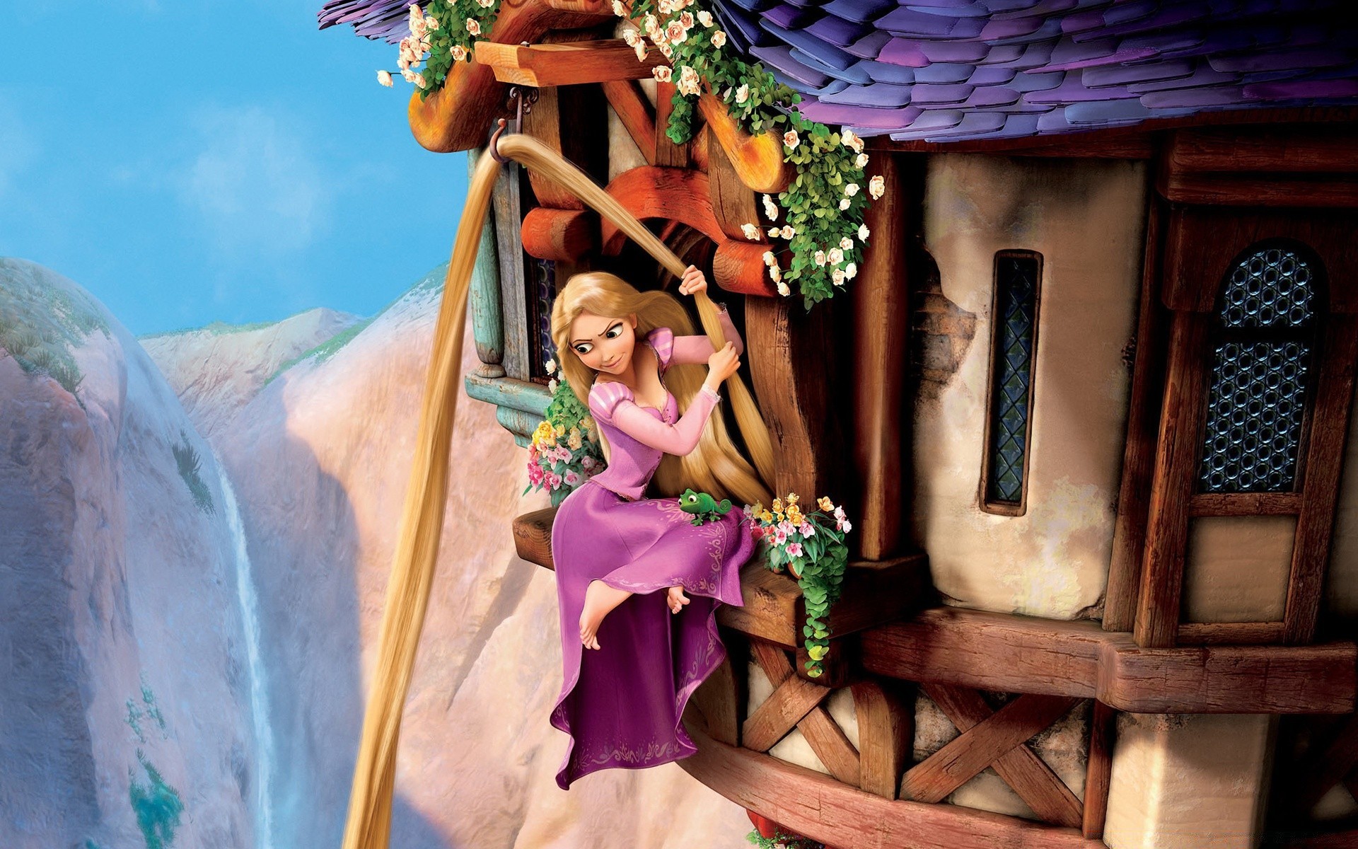 Raiponce avec une longue tresse descend de la fenêtreRaiponce avec une longue tresse descend de la fenêtre