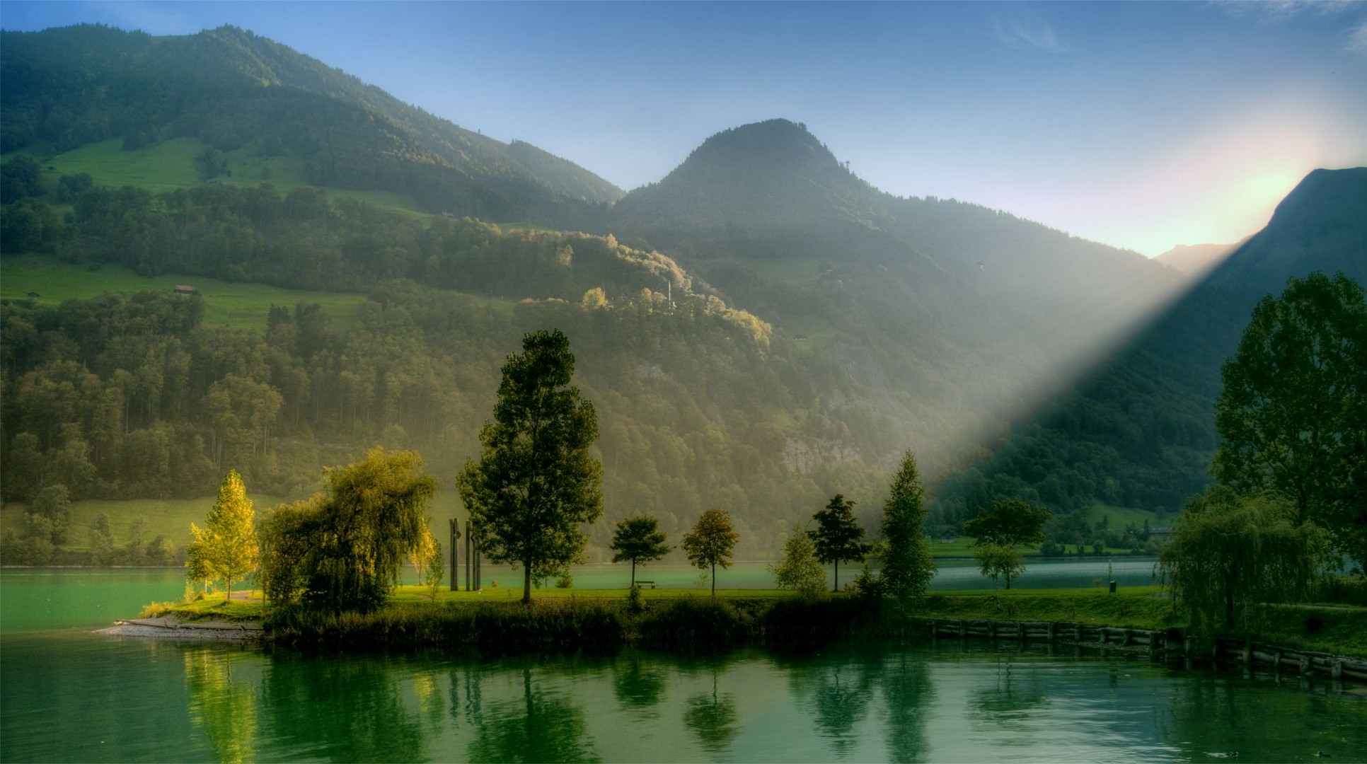 La chute des rayons du soleil sur la forêt et l'étang