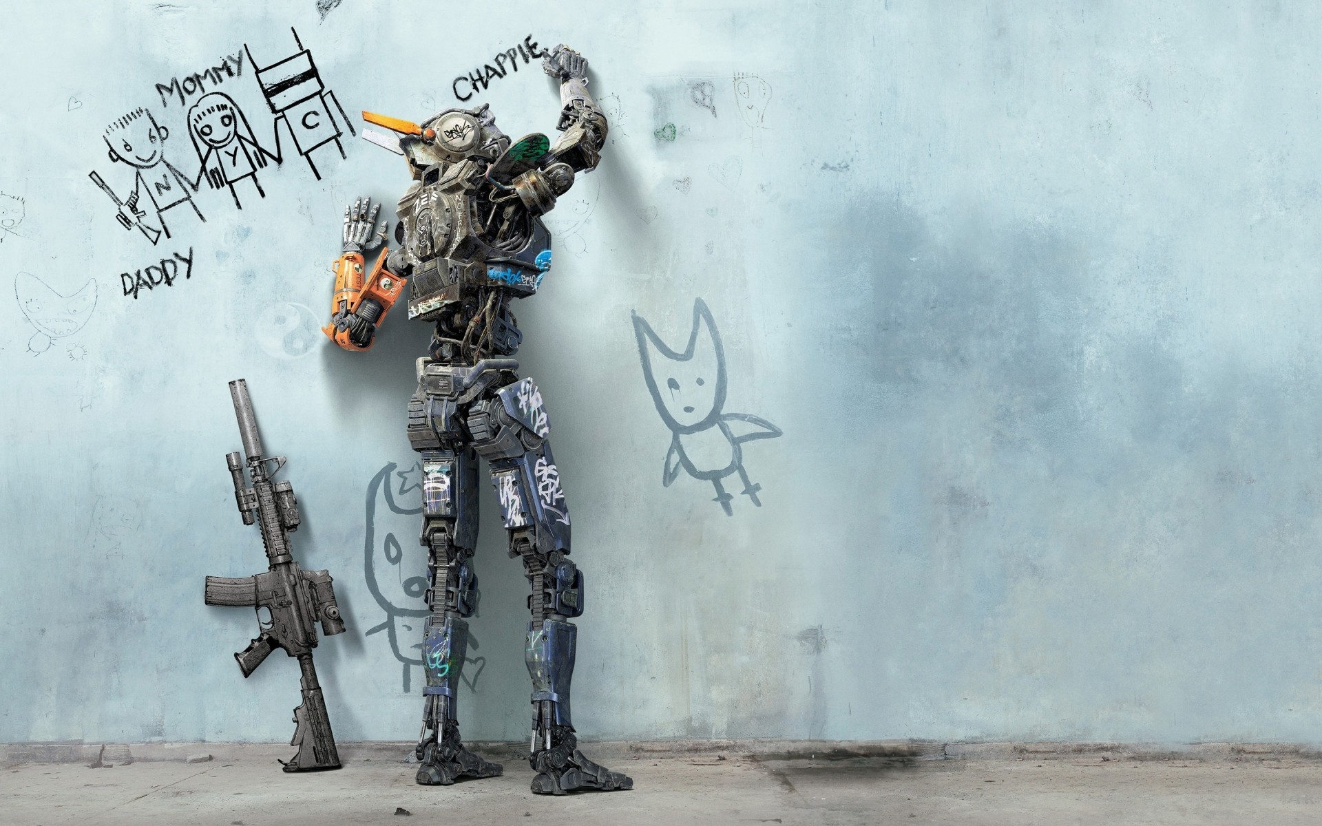 Deux hommes regardent la fille du robot qu'ils ont créée