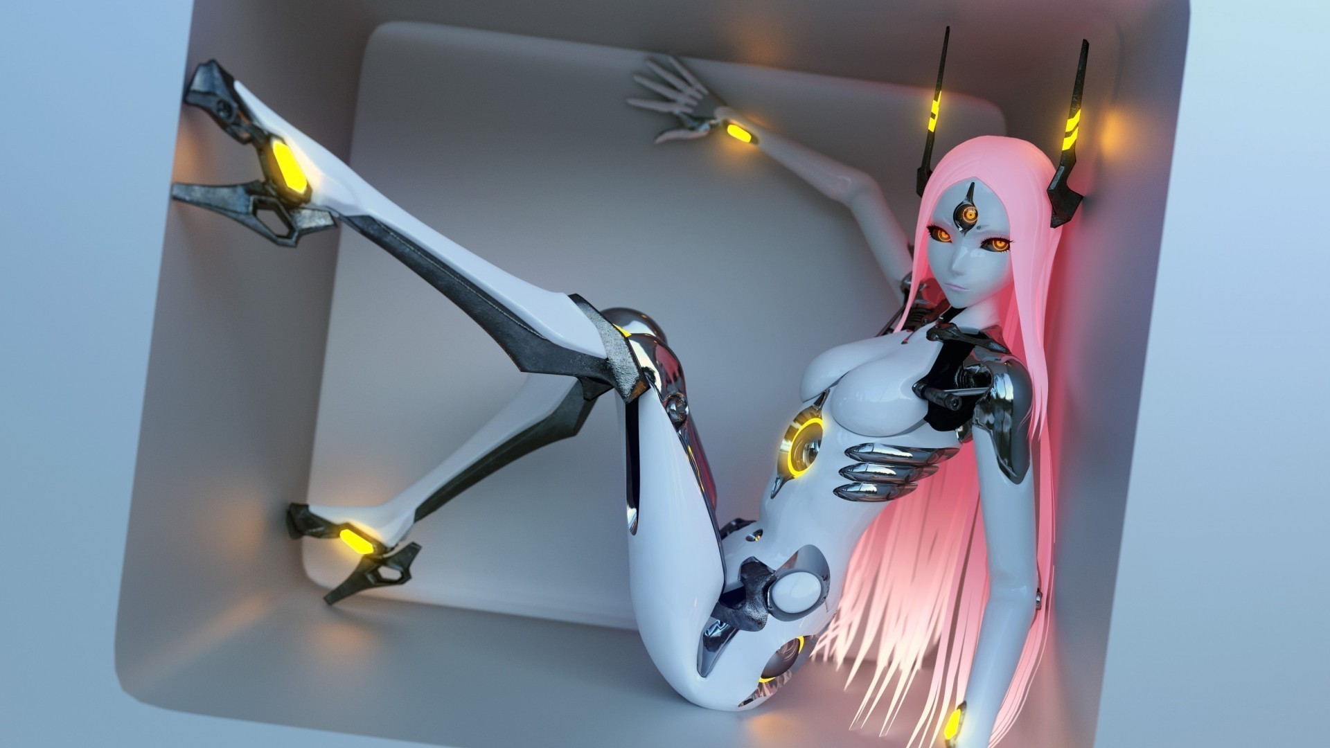 Silhouette d'un robot avec des yeux lumineux sur un fond flou avec des reflets
