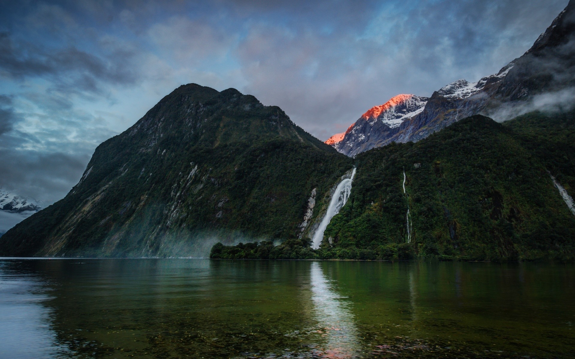 Ruisseaux d'eau s'échappant sur les rochers sur fond de ciel nuageux