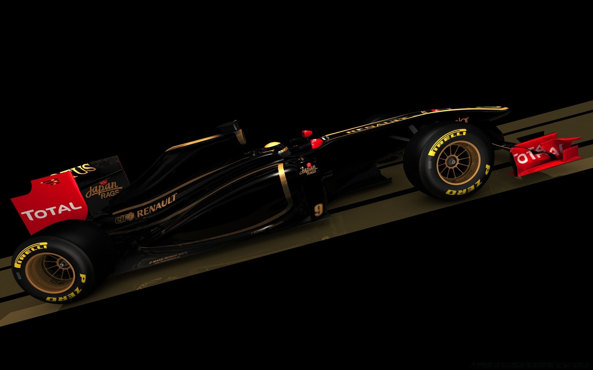 Voiture noire, sur fond noir. Formule un, roues jaunes