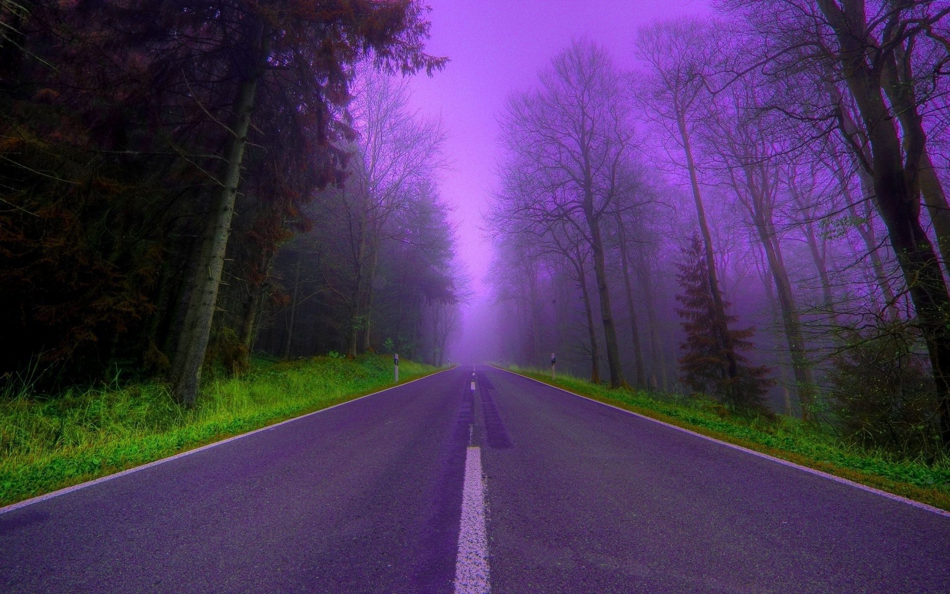 Une route goudronnée qui part dans la forêt brumeuse