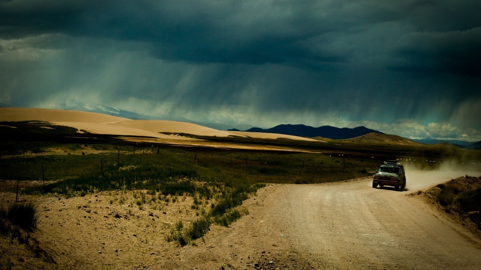 La voiture roule sur la route, et derrière elle l'obscurité de la poussièreLa voiture roule sur la route, et derrière elle l'obscurité de la poussière