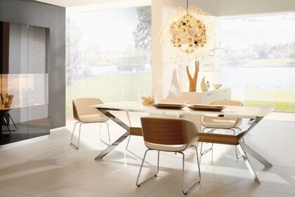 Salle à manger ensoleillée avec fenêtres panoramiques