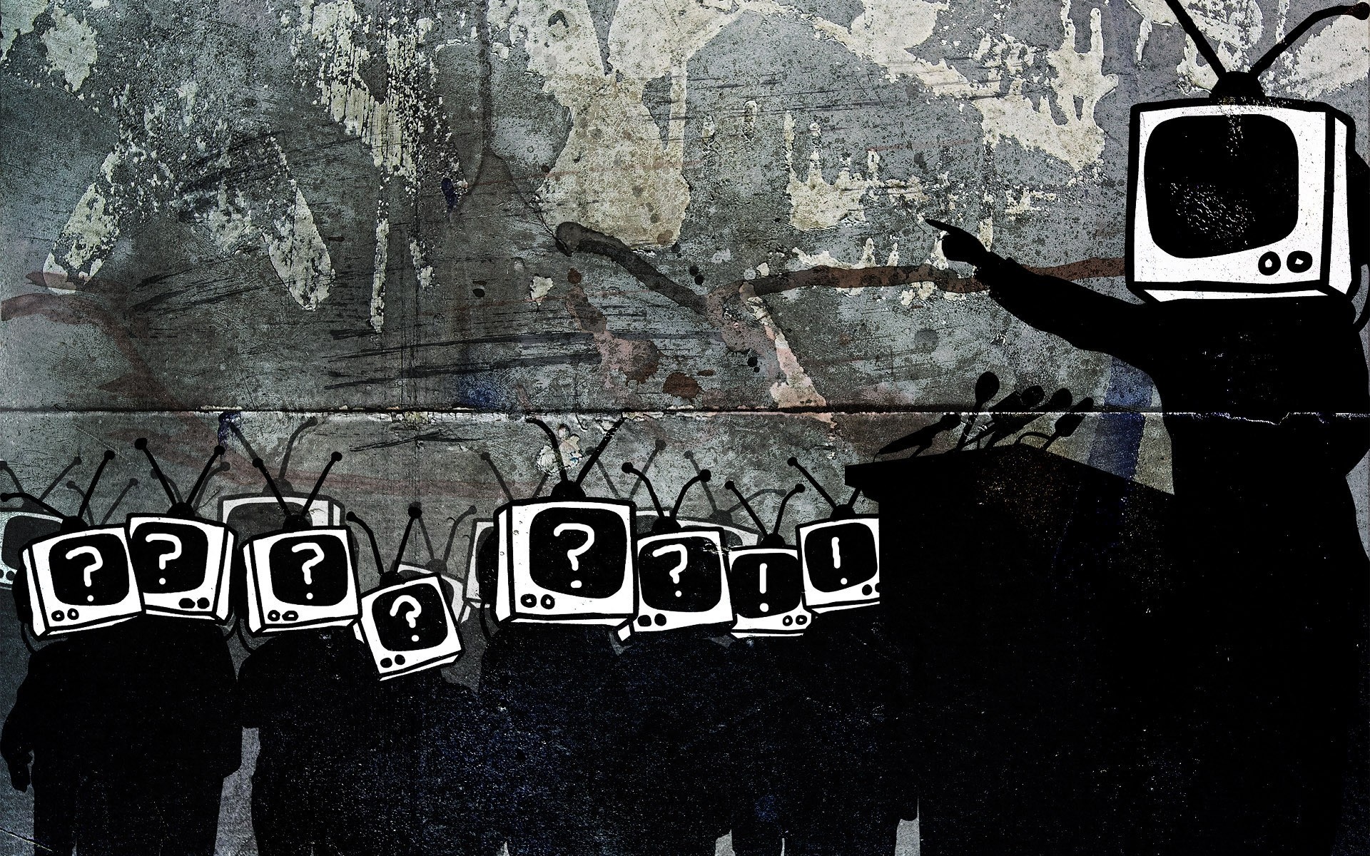 Graffiti sur un mur de béton gris représentant des personnes avec des téléviseurs au lieu de têtesGraffiti sur un mur de béton gris représentant des personnes avec des téléviseurs au lieu de têtes