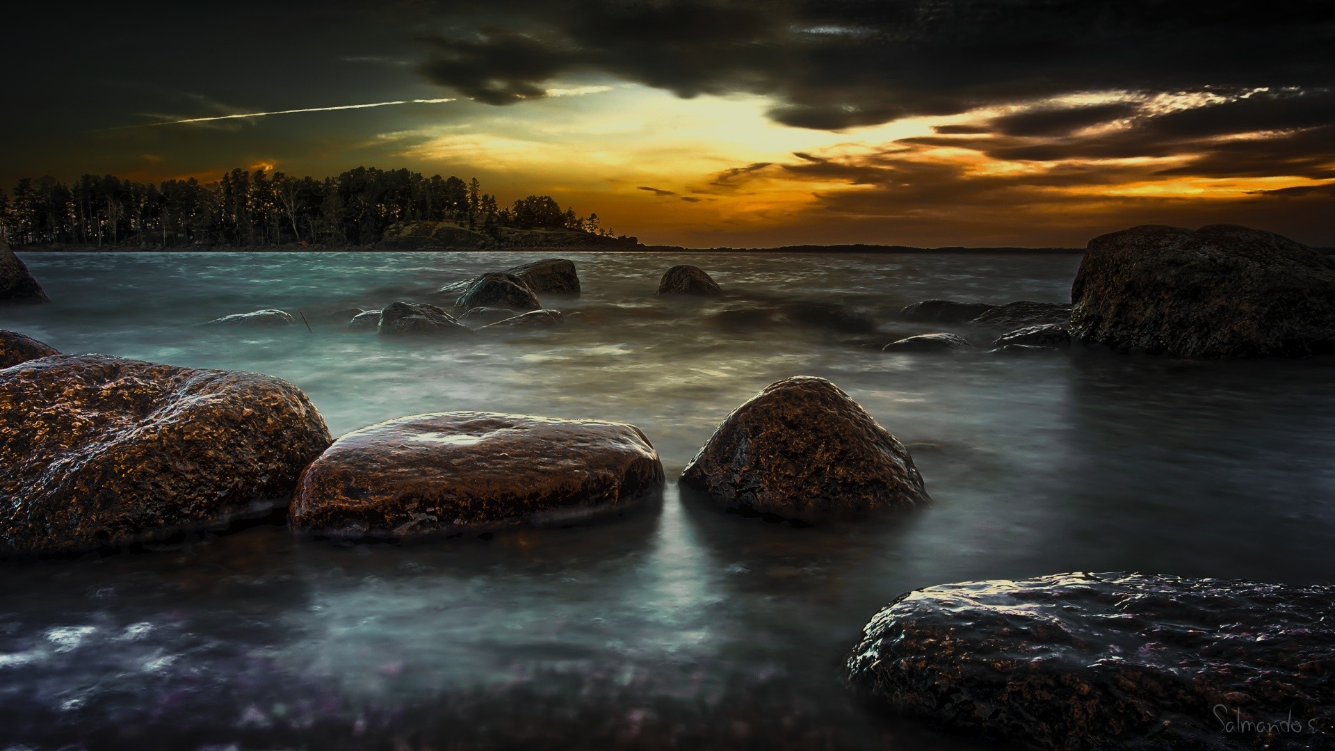 Image du coucher de soleil parmi les montagnes et les rivières