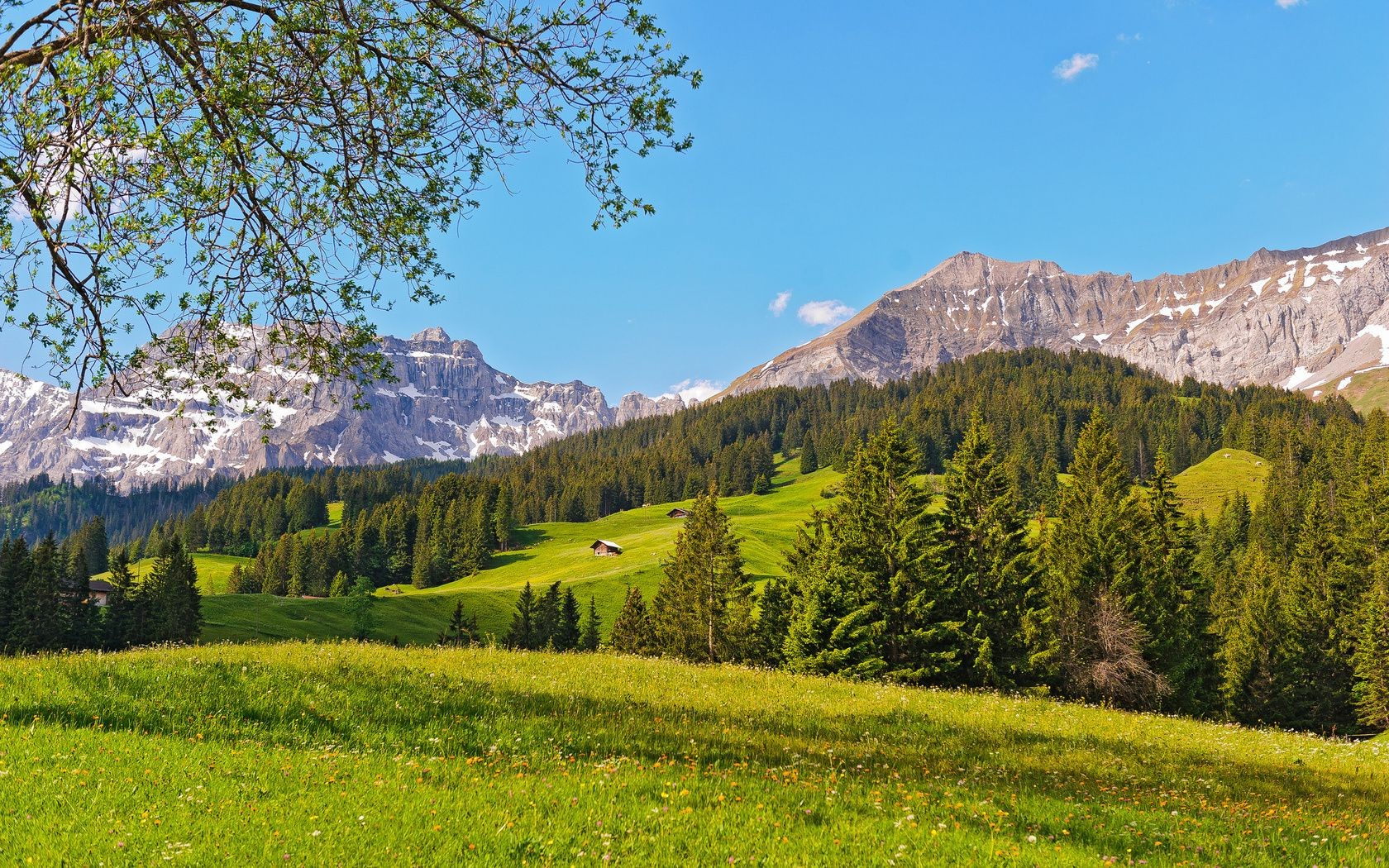 Vallée verte sur fond de hautes montagnes