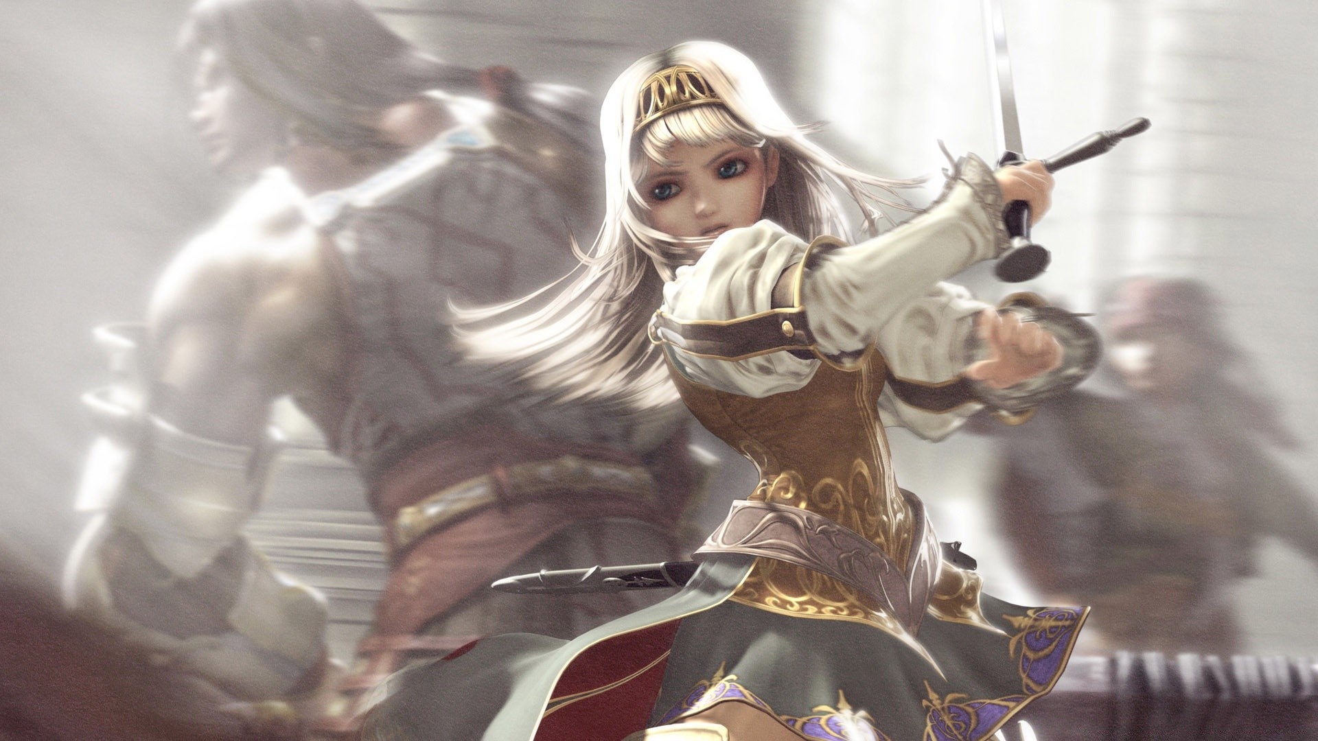 Une guerrière aux cheveux d'argent se Bat avec une épée à la main