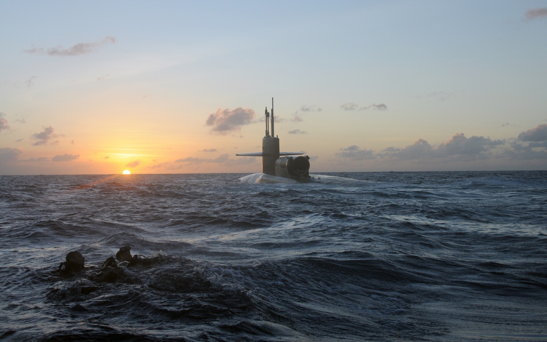 Coucher du soleil. Sous-marin soulève hors de l'eau