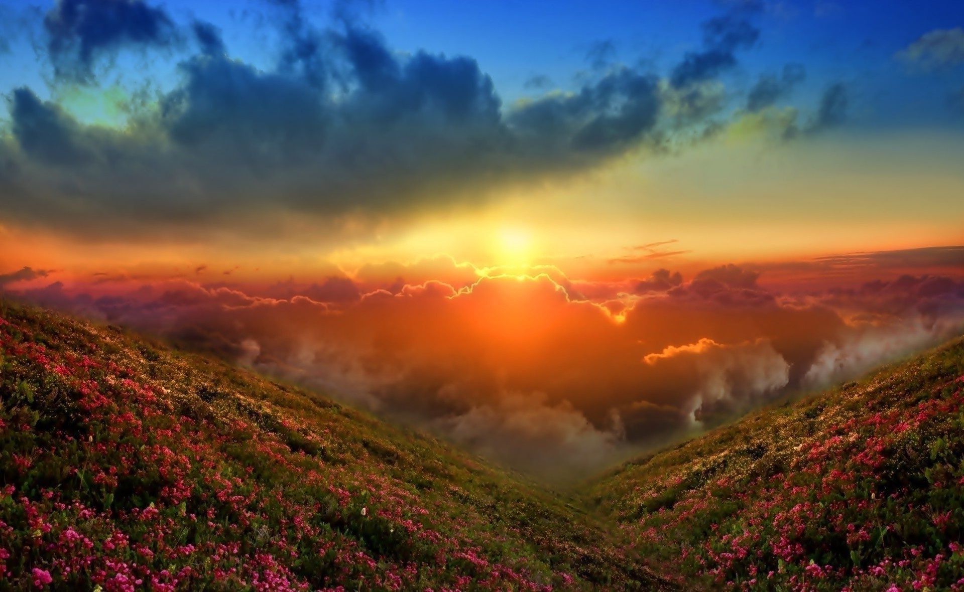 Coucher de soleil dans les montagnes fleuries sur les nuages