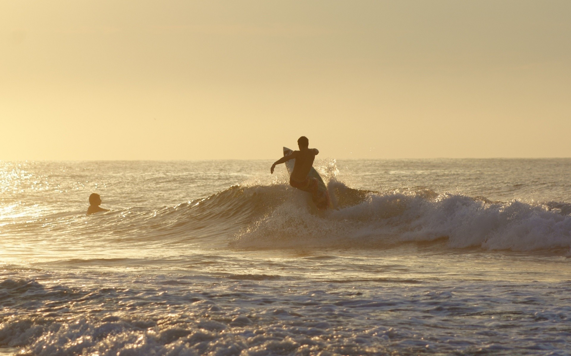 Surfeur sur les vagues au coucher du soleil du soir