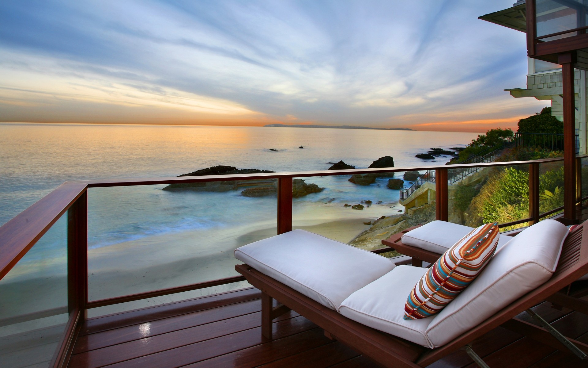 Chaises longues sur la terrasse du chalet avec vue sur la mer