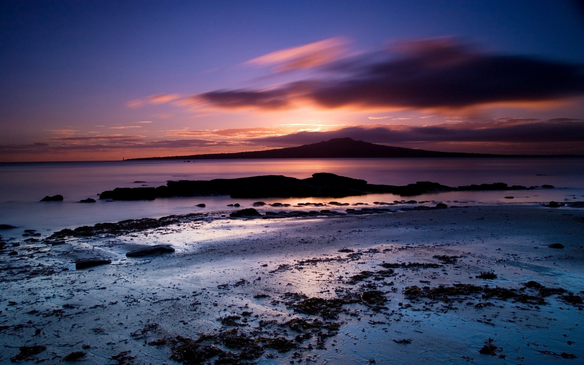 Coucher de soleil cuivre incroyablement enchanteur sur la mer au calme