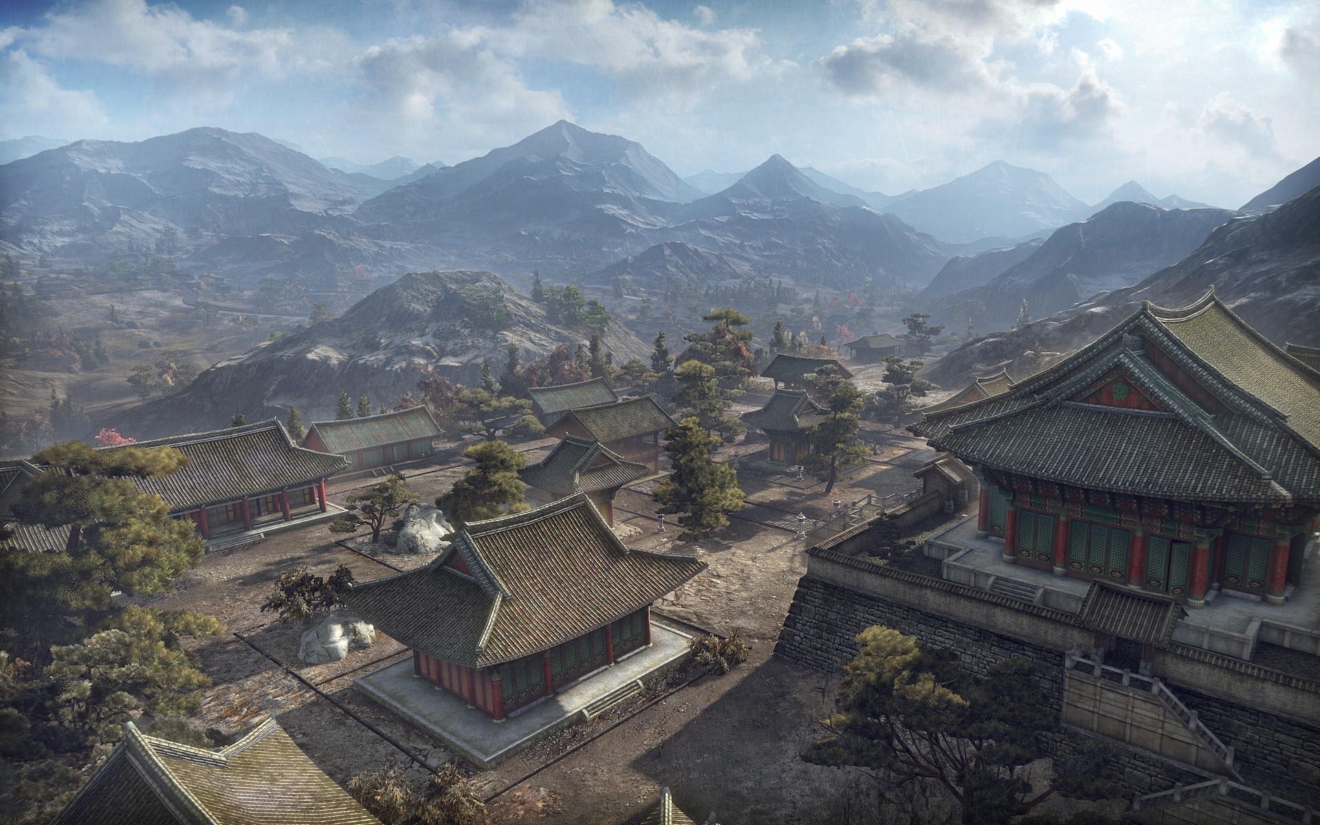 Maisons architecturales sur fond de montagnes