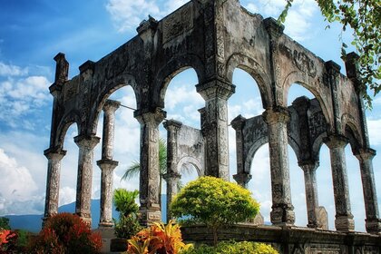 Sur les deux rives de la rivière bleue de l'église et des arbres verts sur fond de ciel bleuSur les deux rives de la rivière bleue de l'église et des arbres verts sur fond de ciel bleu