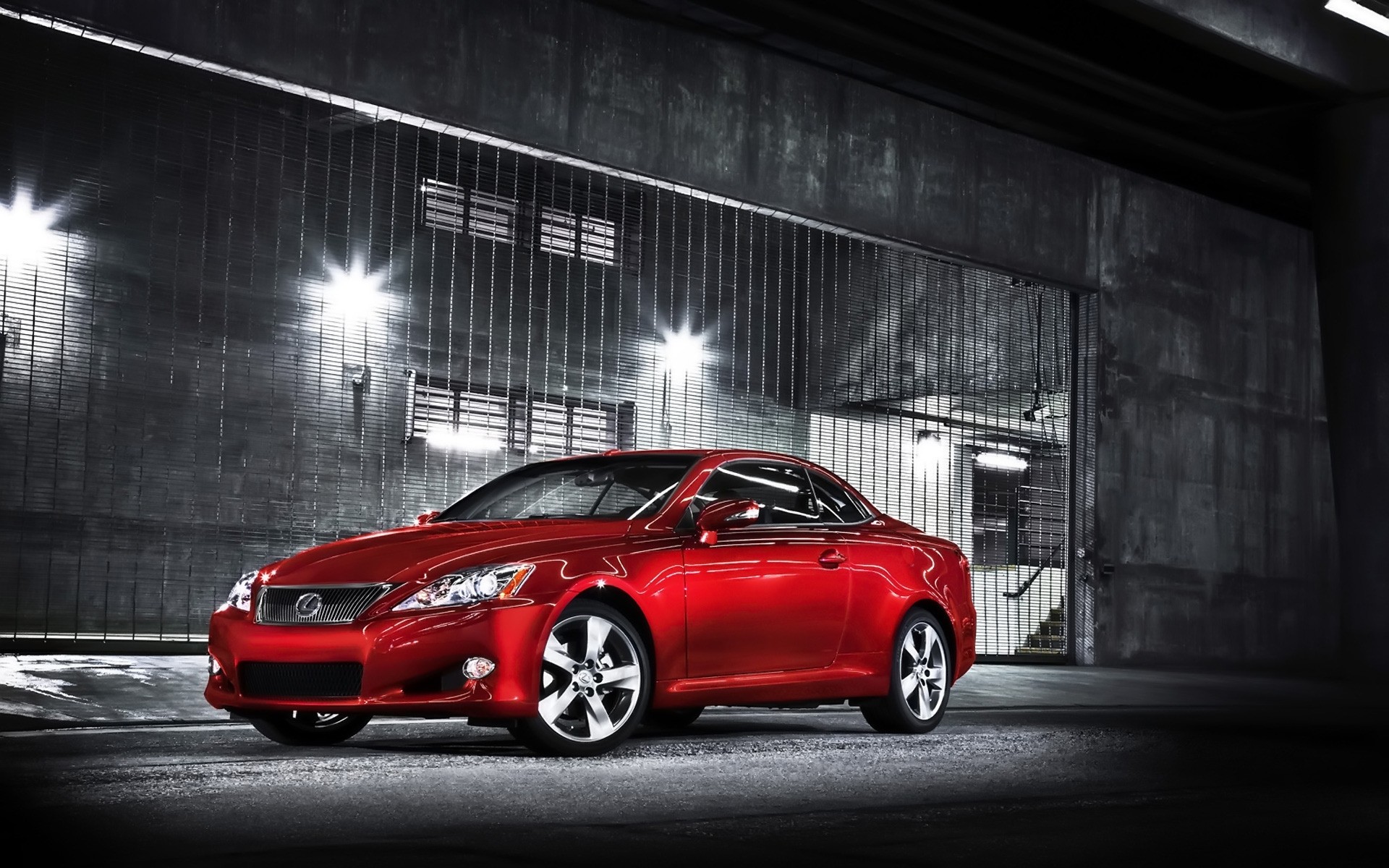 Une voiture rouge se tient près du hangar