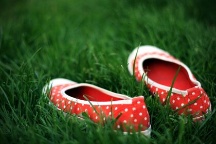Baskets rouges avec lacets blancs sur fond de cielBaskets rouges avec lacets blancs sur fond de ciel