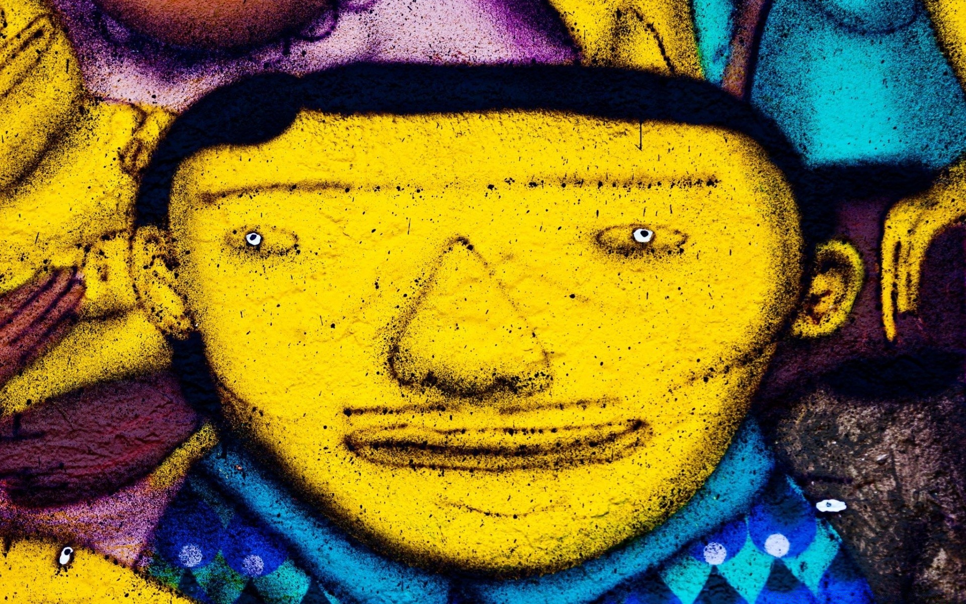 Fallout, un graffiti représentant un personnage reproduit dans un costume bleu à rayures jaunes
