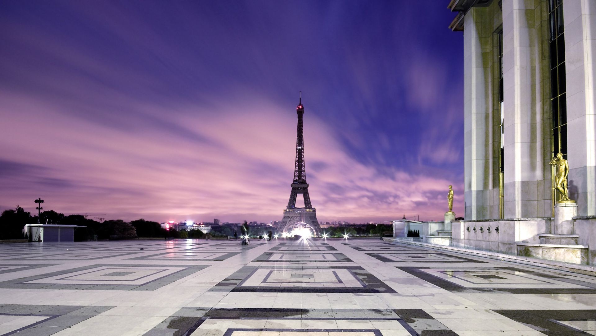 , Tour Eiffel à travers la place dans les rayons du coucher du soleil