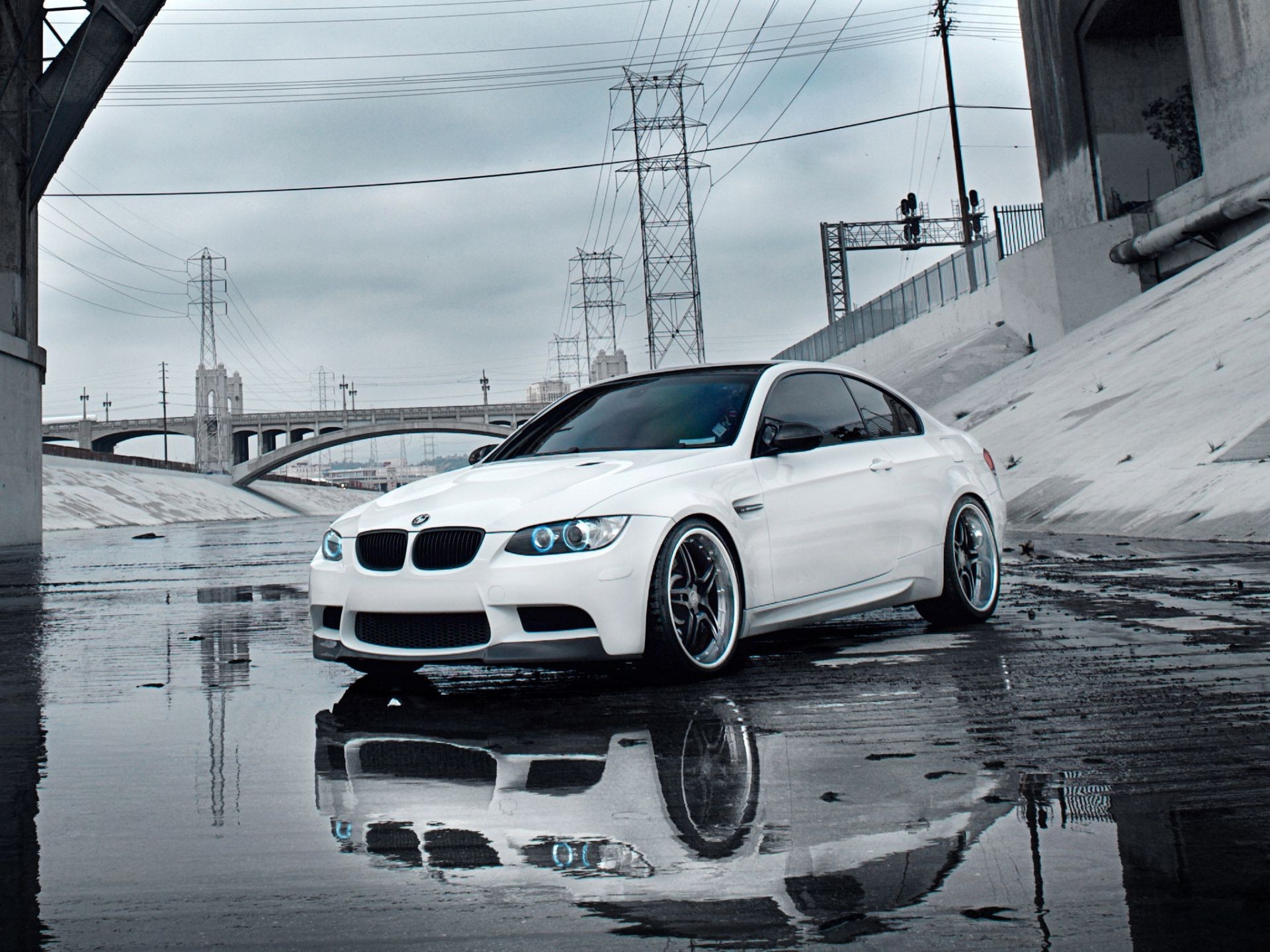 Une voiture blanche sportive se reflète dans une flaque d'eau