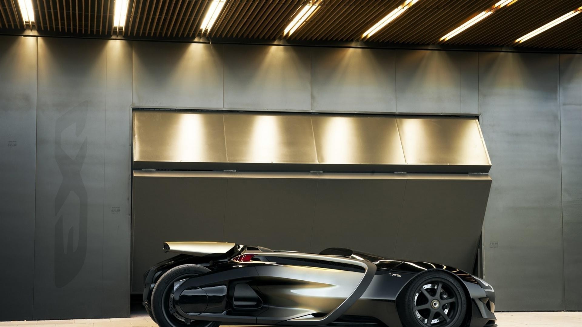 Voiture de sport noire à l'intérieur d'un garage haut de gamme consacrée par des lampes