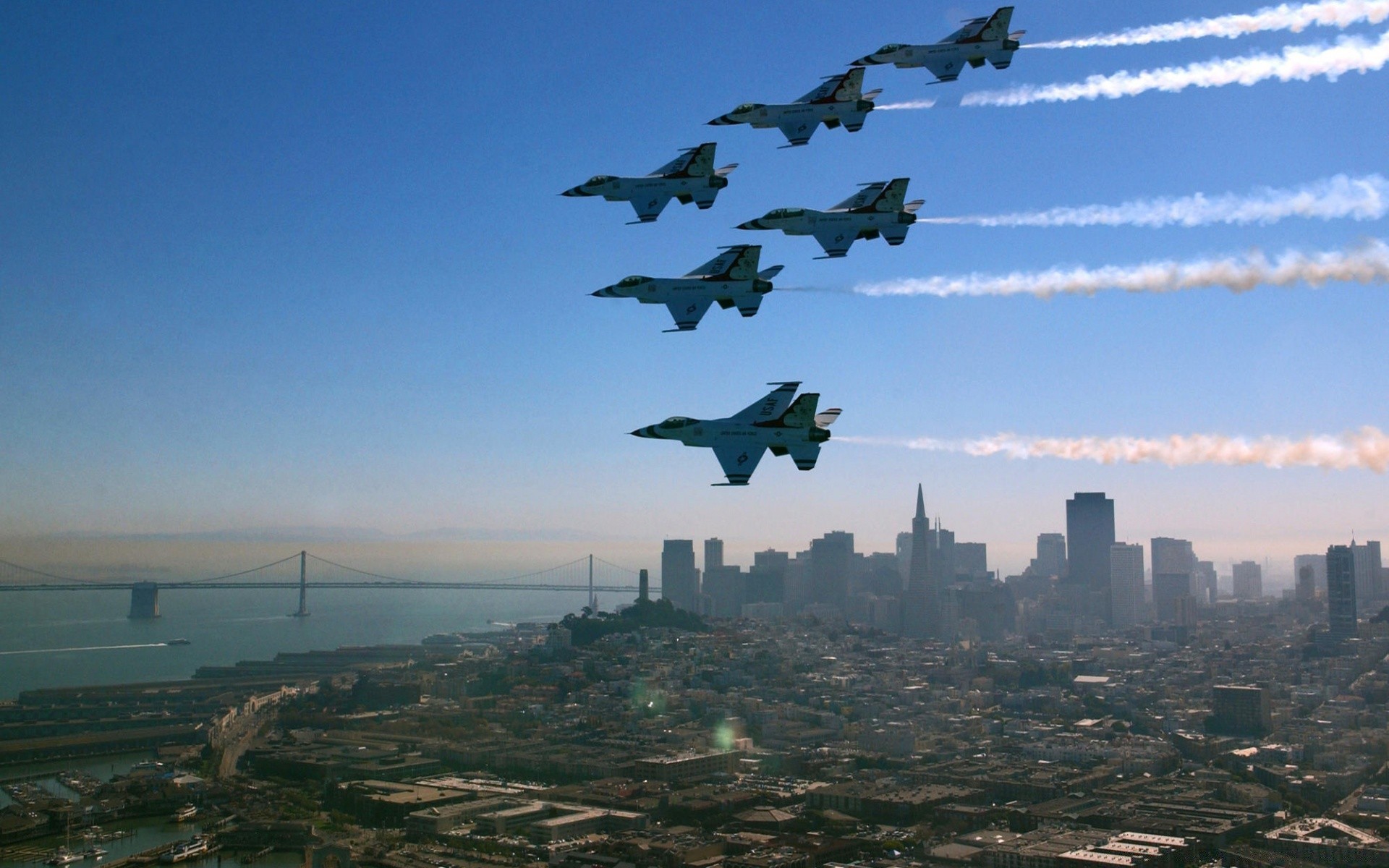 Sur fond orange nuages blancs, pont noir, montagnes et vagues