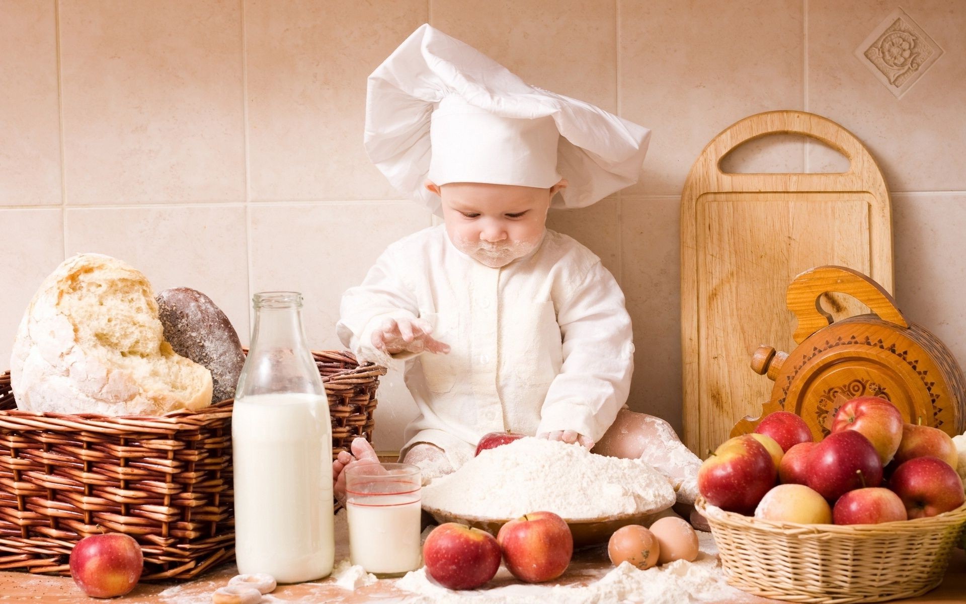 Bébé cuisinier sur la table et le visage dans la farine