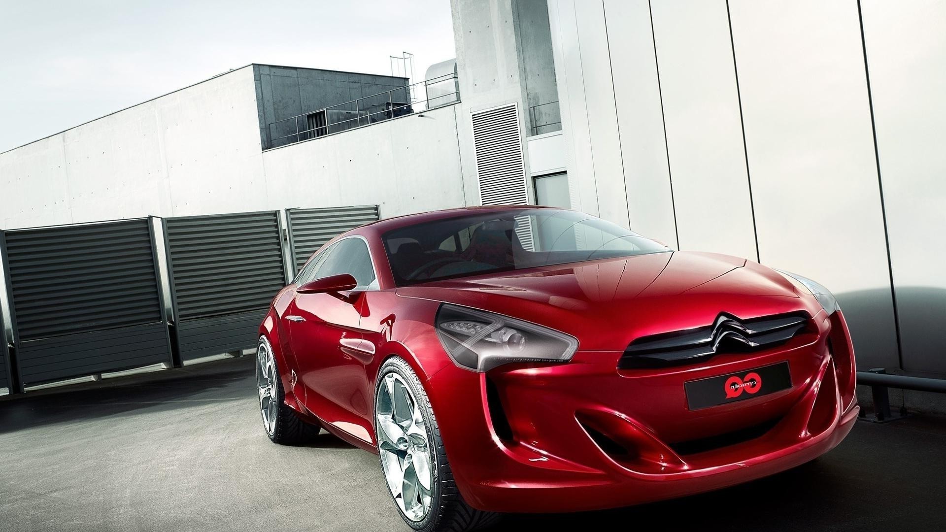 Voiture écarlate brillant brillant sur fond de béton gris