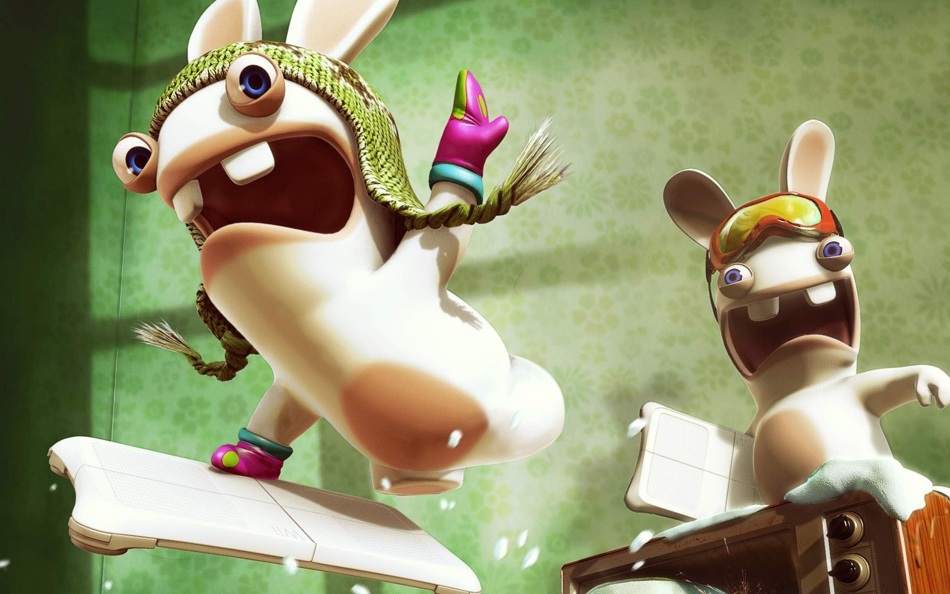 Un lièvre aux yeux bombés maîtrise le snowboard