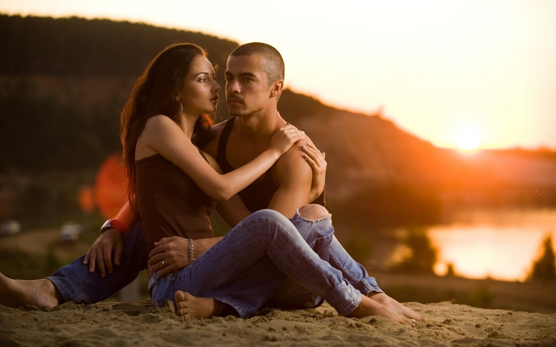Mec avec une fille sur la plage près de la mer regarder le ciel bleu