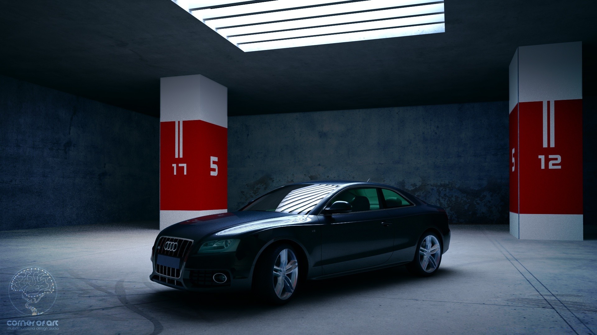 Voiture debout sur le parking souterrain entre les poteaux blancs et rouges avec des numéros