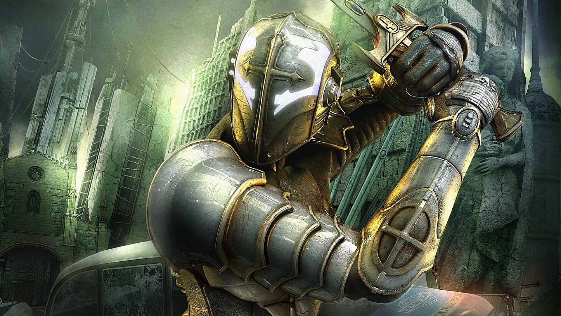 Un homme en costume d'acier est protégé par une épéeUn homme en costume d'acier est protégé par une épée