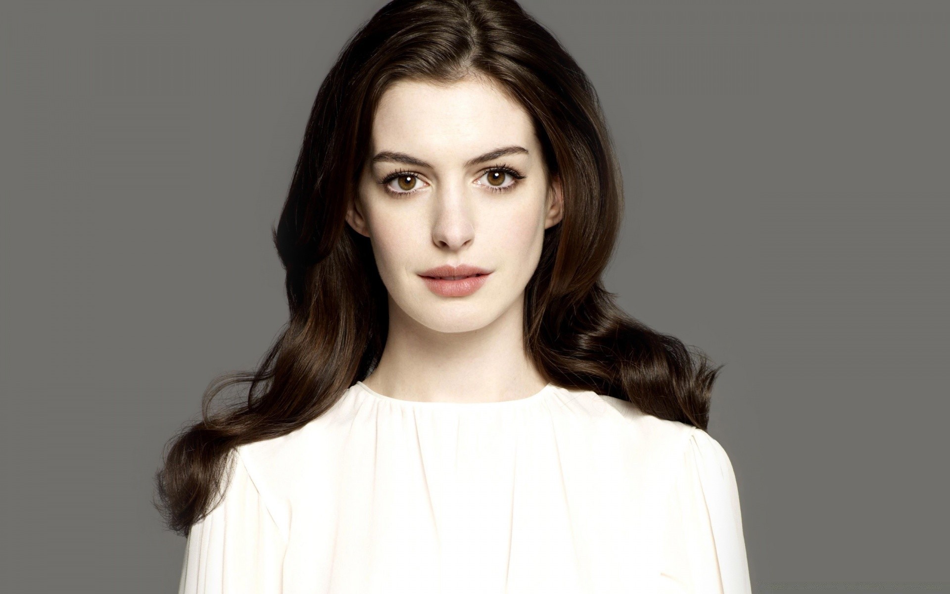 Photo d'une brune aux yeux bruns en blouse blanche sur fond gris