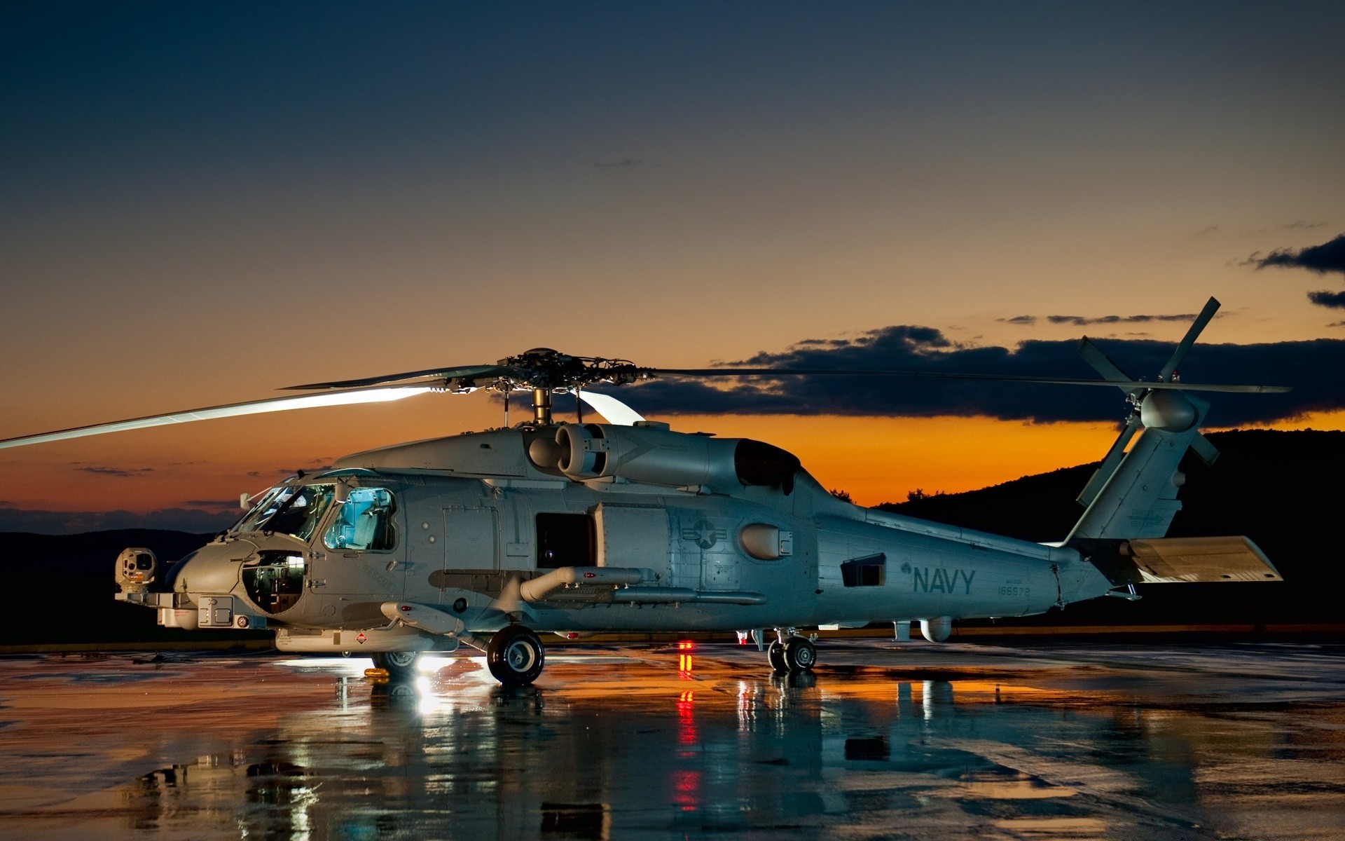 Groupe d'hélicoptères militaires sur le terrain de décollage sur fond de soleil couchant