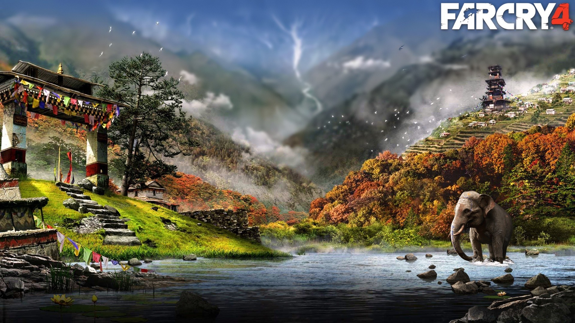 Paysage de style asiatique avec pagode et éléphant du jeu Farcry 4